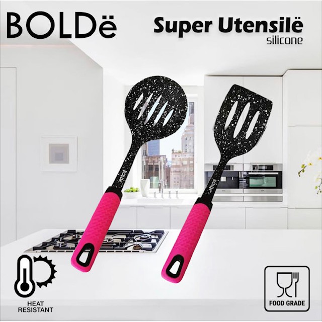 BOLDe kini hadir dengan peralatan memasak BOLDe Super Utensil silicone, di rancang khusus dengan granite model berwarna blackpink yang elegan. untuk kenyamanan memasak anda. BOLDe Super Utensil menggunakan silicon dengan Premium Quality Grade yang sangat nyaman digunakan untuk aktivitas memasak anda. Fitur Superb Heat Resistance yang ada di BOLDe Super Utensil ini tahan panas hingga 220 derajat celsius. Bagian gagang handle dirancang khusus untuk melindungi jari tangan anda supaya tidak terkena wajan yang panas saat digunakan serta nyaman saat digenggam. Bagian gagang handle BOLDe Super Utensil juga dilengkapi dengan lubang penggantung berbentuk unik, yang memudahkan anda menyimpannya sehingga dapur anda akan terlihat rapih.-FDA Approved-Food Grade Silicone-Premium Quality-Elegant Design with Granite Model-Superb Heat Ressistances-Dangan Premium silicone Material, BOLDe Super Utensil sangat cocok digunakan dengan produk BOLDe Super Pan dan peralatan masak berlapis Coating lainnya.Bahan : silicone lenturTerbuat dr bahan Food Grade Silicone yang bebas BPA ? PFOA dan bahan kimia berbahaya lain nyatidak akan membuat goresan diperalatan masakcocok dipakai di panci coating granite , ceramiccara penggunaan yang tepat :bisa dipakai untuk menumis , gorengsaat tidak dipakai untuk menumis sebaiknya sutil / spatula di letakkkan di samping ( diluar) p