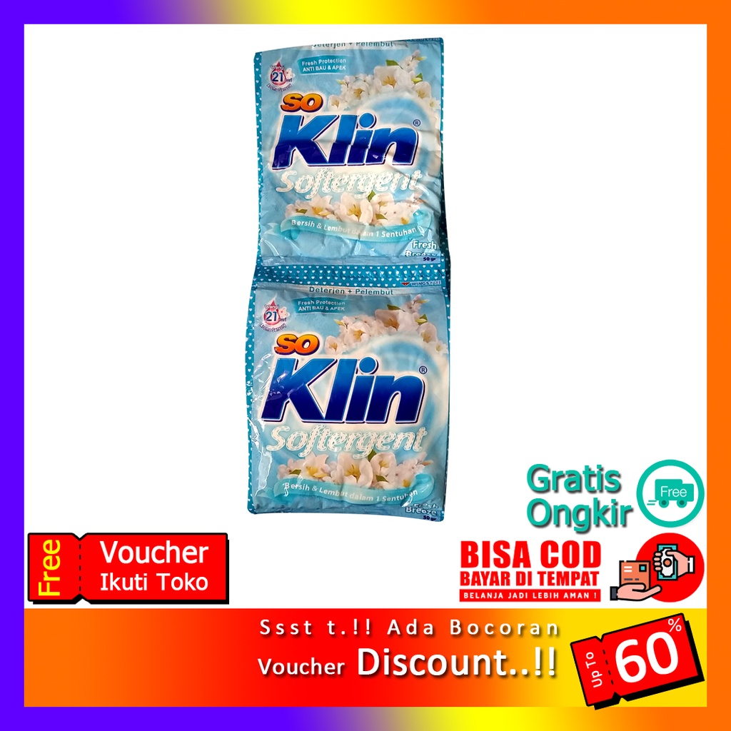 Promo | Soklin Softergent Biru Fresh Breezee 50 gr | MurahSoKlin Softergent adalah deterjen dengan pelembut yang digunakan untuk memudahkan saat mencuci pakaian sehari hari . SoKlin Softergent terbukti ampuh membersihkan noda pada semua jenis pakaian sekaligus melembutkannya. SoKlin Softergent menjadi pilihan tepat untuk Anda yang menginginkan kemudahan mencuci pakaian.Baju akan wangi selama 21 hari karena mengandung fresh protection yang akan membuat baju anti bau dan apek..#soklinsoftergent #soklinbiru #sabunpakaian #sabuncuci #soklinsabu