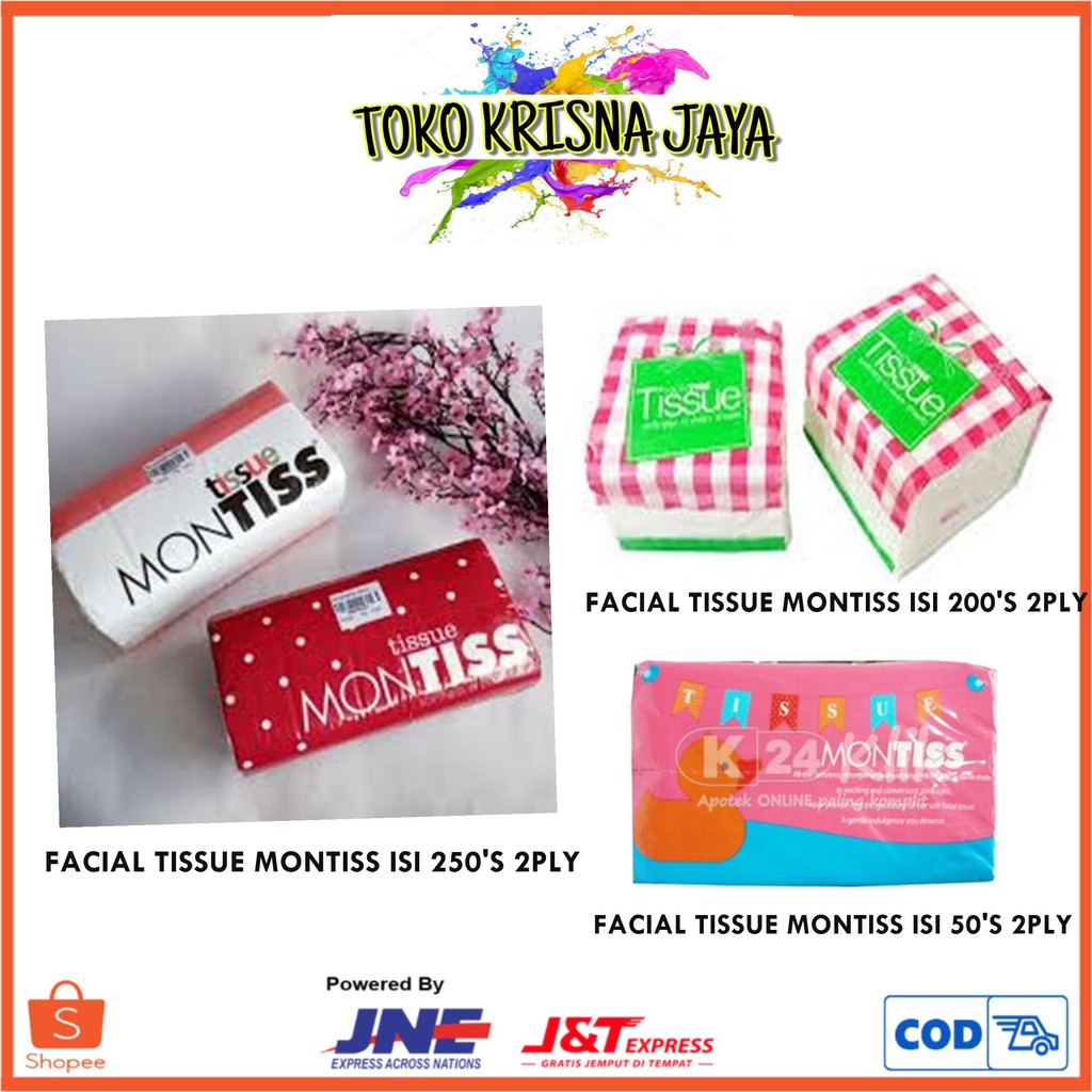 FACIAL TISSUE TISSUE MONTISS 2PLY ISI 50'S | 200'S | 250'SMontiss Tissue Facial adalah tissue wajah yang terbuat dari bahan berkualitas dan diproses secara higienis sehingga nyaman, dan lembut saat dipakai.HAPPY SHOPPING :) BERI BINTANG 5 UNTUK SETIAP PENILAIAN. TERIMAKASIH#tiisu #tissue #tessa #facial #murah #berkualitas #baik #le