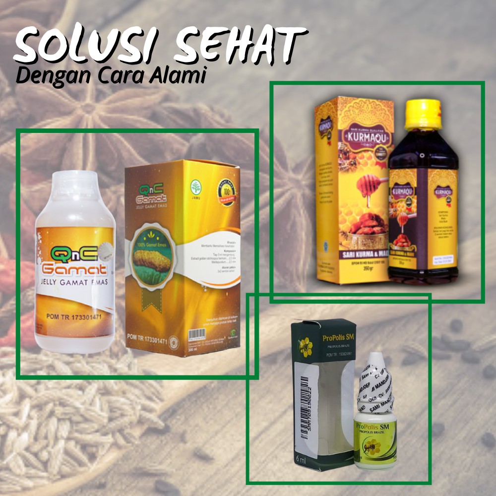QNC JELLY GAMAT* Nama Produk : QnC Jelly Gamat* Kemasan : Botol plastik @ 300ml* Bentuk Sediaan : Cairan Setengah Padat* HALAL - MUI* DEPKES P-IRT No. 109321601291-1229* BPOM TR173301471-Aturan Konsumsi :Anak : 1 Sendok Makan, 3x sehari (pagi dan sore)Dewasa : 2 Sendok makan 3x sehari (pagi, siang, malam)Sebagai Obat Oles :Oleskan pada bagian kulit yang sakit 3 kali sehari (diamkan 20-30 menit) kemudian bilas.SARI KURMADETAIL PRODUK :Isi : 350 gramDINKES : 109321601291-1229 dan HALAL MUICARA KONSUMSI :2 Kali sehari, 2 sendok makan setiap minumnya. [ BOLEH ] Ibu Hamil & Menyusui , BalitaPropolis SM* Kemasan : Botol plastik* isi & Bentuk Sediaan : 6 ml, cair* HALAL - MUI* BPOM RI TR 153634231* Komposisi : Ekstrak Propolis BrazilianAturan Konsumsi :Untuk Kesehatan : Teteskan 3-4 kali dalam 1/4 air putihUntuk Pengobatan : Teteskan 5-10 kali dalam 1/4 air
