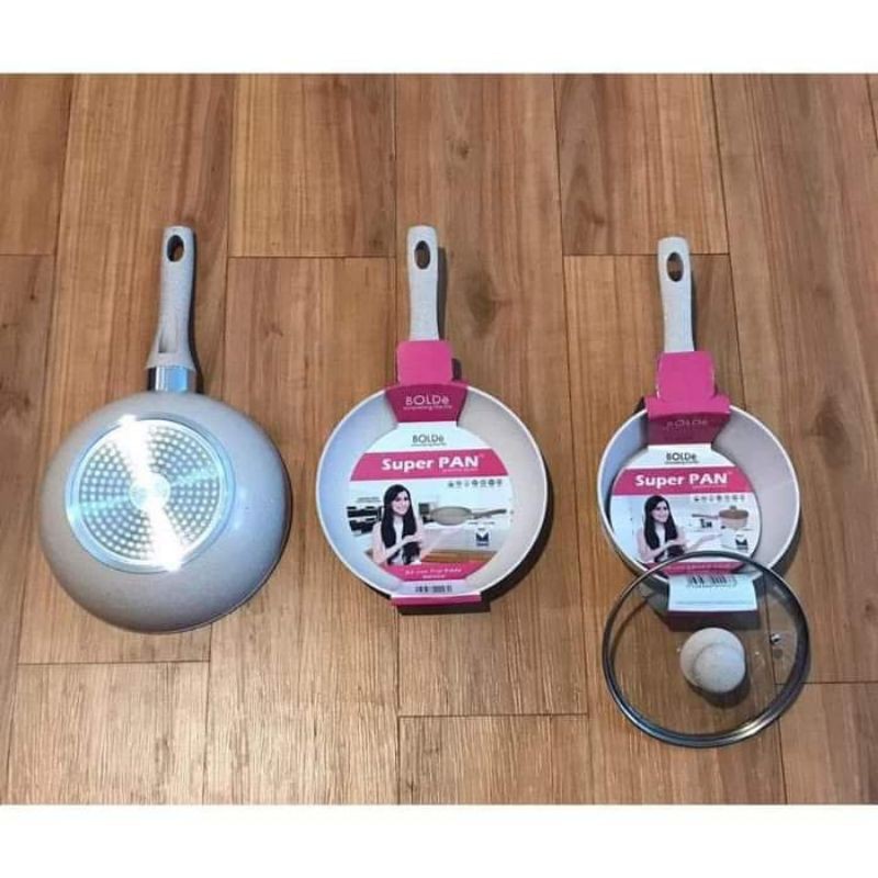 Asli 3 pcs peralatan masak yang terdiri dari 18 cm saucepan dengan penutup kaca, 22 cm fry pan dan 24 cm wok. ( bukan seperti merk lain ngaku2 5 sets tp isi asli peralatan masak hanya 2 pcs dimana yang lain hanya aksesoris ) Peralatan masak berkualitas tinggi dengan bahan granit dengan ECO GREEN Technology yang ramah lingkungan dan tidak mengandung bahan kimia berbahaya. Anti Lengket dengan coating warna beige ( krem ). Ketebalan panci 3 mm ( produk teflon biasa hanya 1,5 mm ) Induction bottom untuk jaminan pemanasan yang merata ke seluruh permukaan. 18 cm saucepan dengan penutup kaca cocok untuk memasak mie instan dsbnya. 22 cm frypan cocok untuk menggoreng telur dsbnya. 24 cm wok cocok untuk mengoreng, mentumis, memasak masakan lainnya. Peralatan masak dengan interior & eksterior yang dilapisi oleh kinerja tinggi non-stick PTFE lapisan marmer membuat panci mudah untuk memasak dan dibersihkan. memasak dengan sedikit minyak untuk diet sehat. Tanpa asap, hijau & sehat, permukaan sangat tahan lama , efek anti-lengket yang hebat, ramah lingkungan dan tahan suhu tinggi Super Pan dibuat dari tubuh aluminium die-casting serta dasar induksi yang memastikan kecepatan, distribusi panas yang merata, 3 mm bagian bawah menebal menyediakan distribusi panas yang stabil selama memasak, dan dengan cepat memanaskan sehingga menghemat waktu dan energi serta konduktif panasnya dapat memastikan pembuangan panas yang seragam dan mencegah hot sp