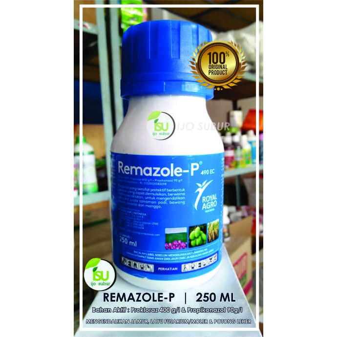 #BARANG ASLI=ORIGINAL#REMAZOLE-P 490 EC (umum)prokloraz (prochloraz) : 400 g/lpropikonazol (propiconazole) : 90 g/lKemasan : 250 MLFungisida yang bersifat protektif berbentuk pekatan yang dapat diemulsikan. Bawang merah : penyakit bercak ungu Alternaria porri, Layu Fusarium/MolerPadi Mencegah Potong Leher, Jamur, Blast, Blorok, Hawar Daun.Merupakan campuran 2 bahan aktif dari Golongan imidazol dan triazol yang bekerja secara sistemik dan translaminar. Bekerja secara protektif, Kuratif dan eradikatif. Ditraslokasikan secara akropetal melalui xylem. #Moler #jamurbawangmerah #bawangmerah #blorok #jamur #blast #ijo
