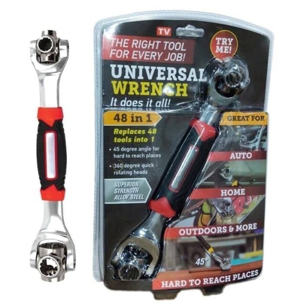 TIGER UNIVERSAL WRENCH adalah alat yang dirancang unik yang menggabungkan 48 alat menjadi satu dan membuat perbaikan cepat & mudah!Cukup diputar dan disesuaikan dengan ukuran yang diperlukan Anda langsung memiliki alat yang Anda butuhkan untuk pekerjaan itu!CEPAT, Bila ANDA SUKA CEPAT! Dengan Tiger Wrench Anda akan selalu memiliki alat yang tepat untuk pekerjaan apapun.Dapat diatur ke sudut 45 derajat untuk menjangkau area yang sulit dijangkau mur dan baut.TEBAL, tahan banting, alat profesional yang dirancang untuk menangani semua proyekAnda di sekitar rumah, di toko, atau di tempat kerja!Ukuran Kemasan : 29 cm x 19.5cm x 5.5 cmUkuran Produk : 15.5 cm x 4 cm x 3 cmUntuk Ukuran Baut : 8mm, 10mm, 11mm, 13mm, 14mm, 16mm, 17mm,